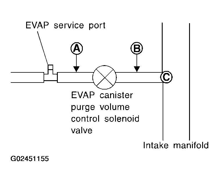- Disconnect purge hoses connected to EVAP service port A and EVAP canister purge volume control solenoid valve B . Refer to Fig 3.