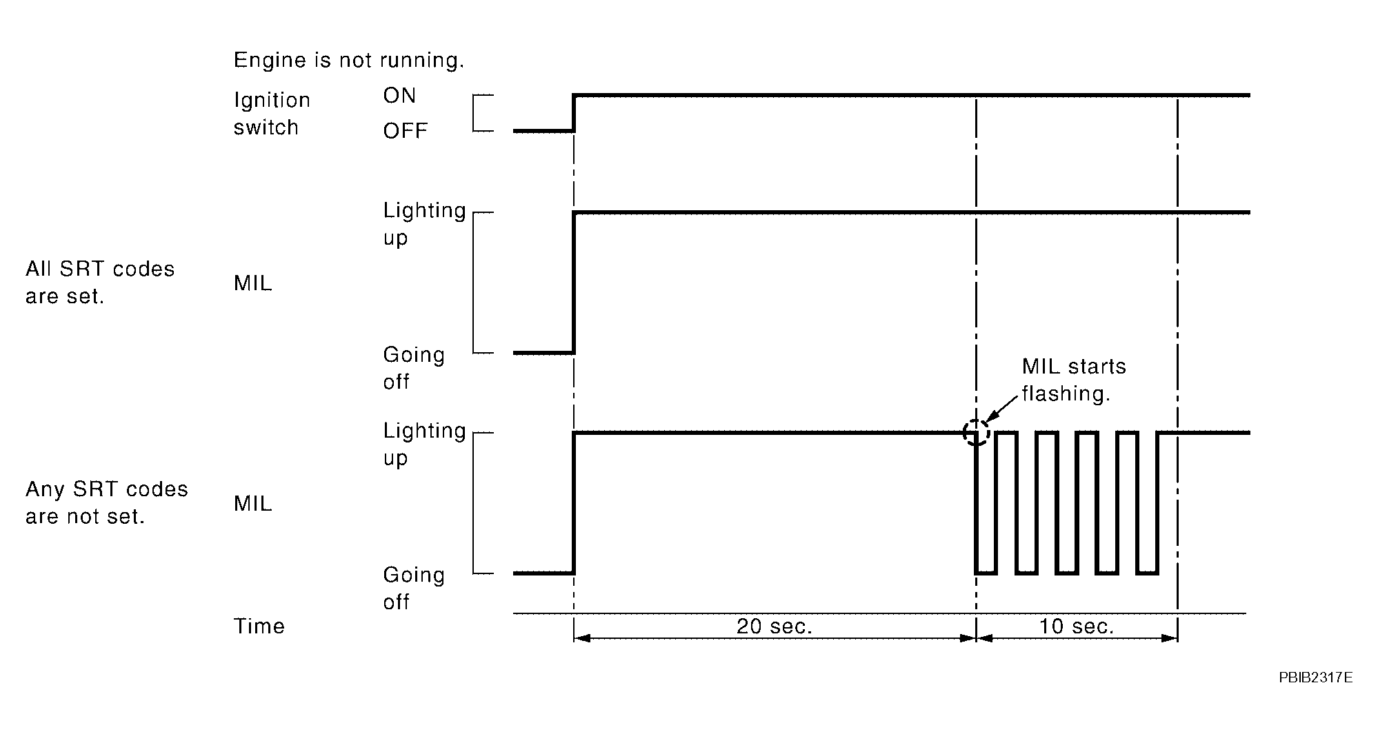 - When any SRT codes are not set, MIL will flash periodically for 10 seconds.