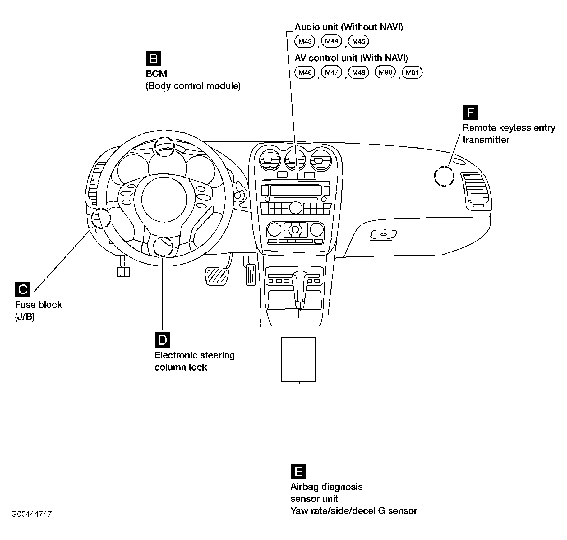 | Fuse Block (J/B) | Behind left end of dash. See Figure. |