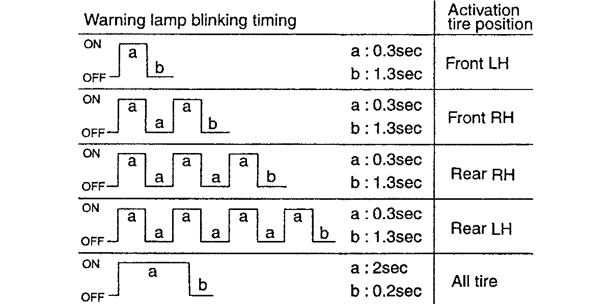 As each sensor ID is activated, the TPMS warning light flashes is the pattern shown in Fig 1, and the scan tool indicator light changes from red to green.