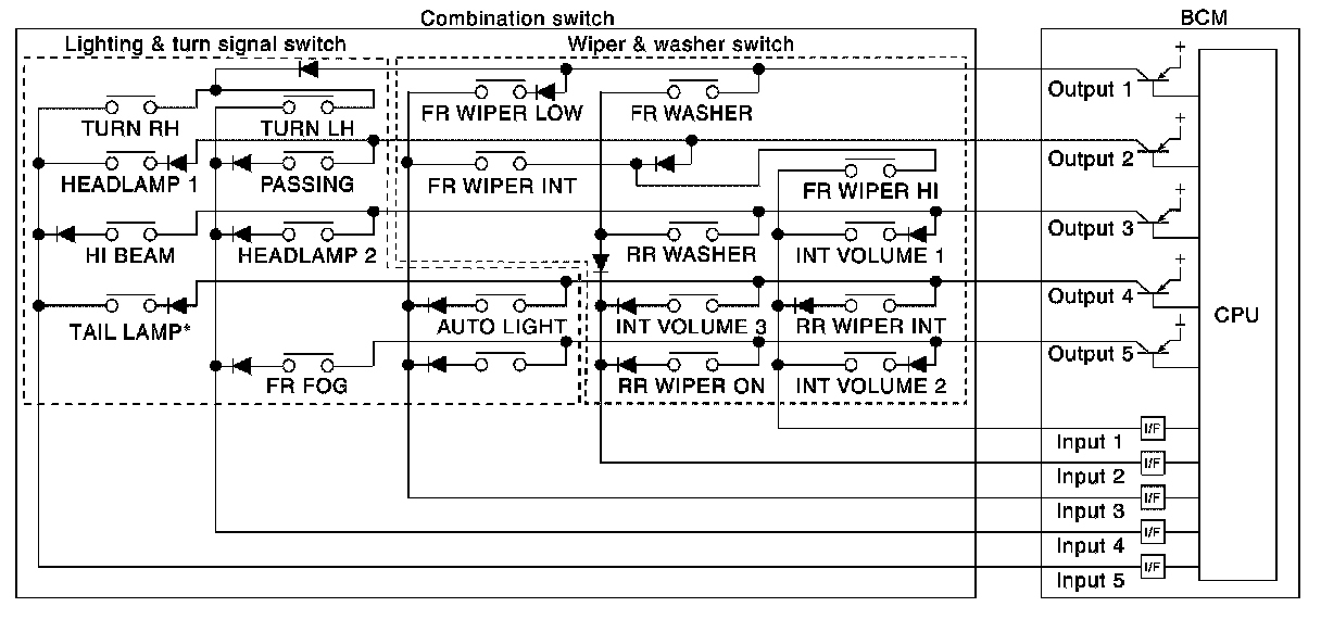 - BCM detects the combination switch status signal "5AD" when the signals of OUTPUT 1 and OUTPUT 4 are input to INPUT 5.
