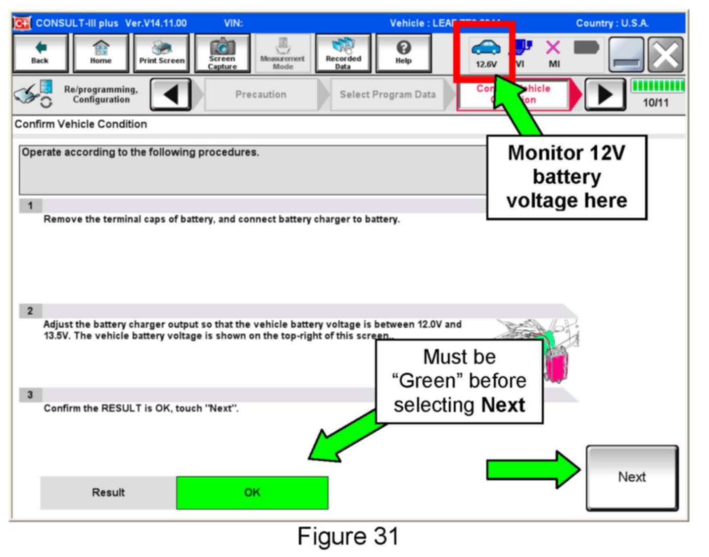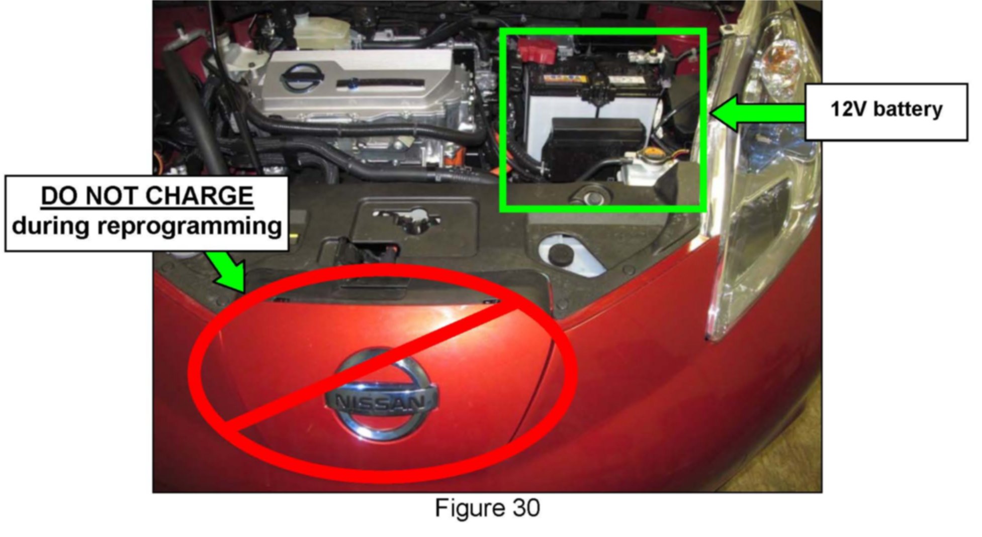 If a Mobile Technician performs the reprogram, make sure a fully charged 12 V battery (with jumper cables) or portable battery charger is used.