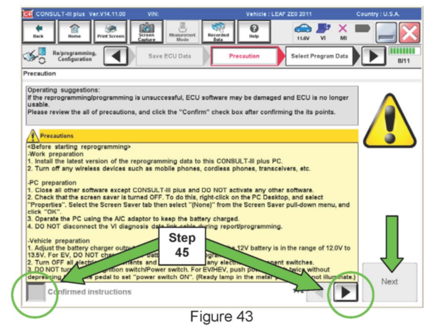 45. Read the precautions at the start of this bulletin and then select page 2 (page 2 not shown) with arrow. After reading page 2 select Confirmed instructions and then Next.