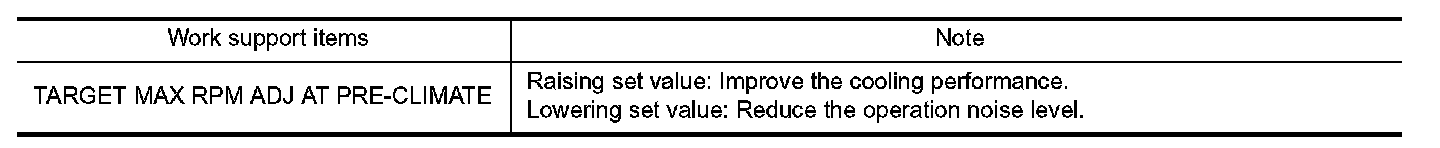 Using CONSULT, select "TARGET MAX RPM ADJ AT PRE-CLIMATE" from "WORK SUPPORT" for "HVAC".