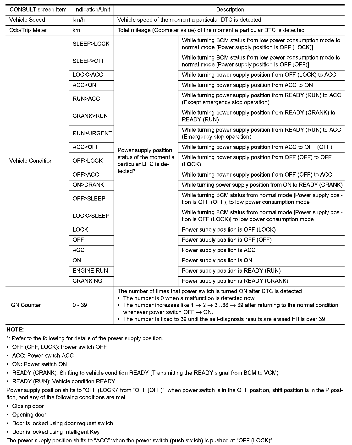 The BCM records the following vehicle condition at the time a particular DTC is detected, and displays on