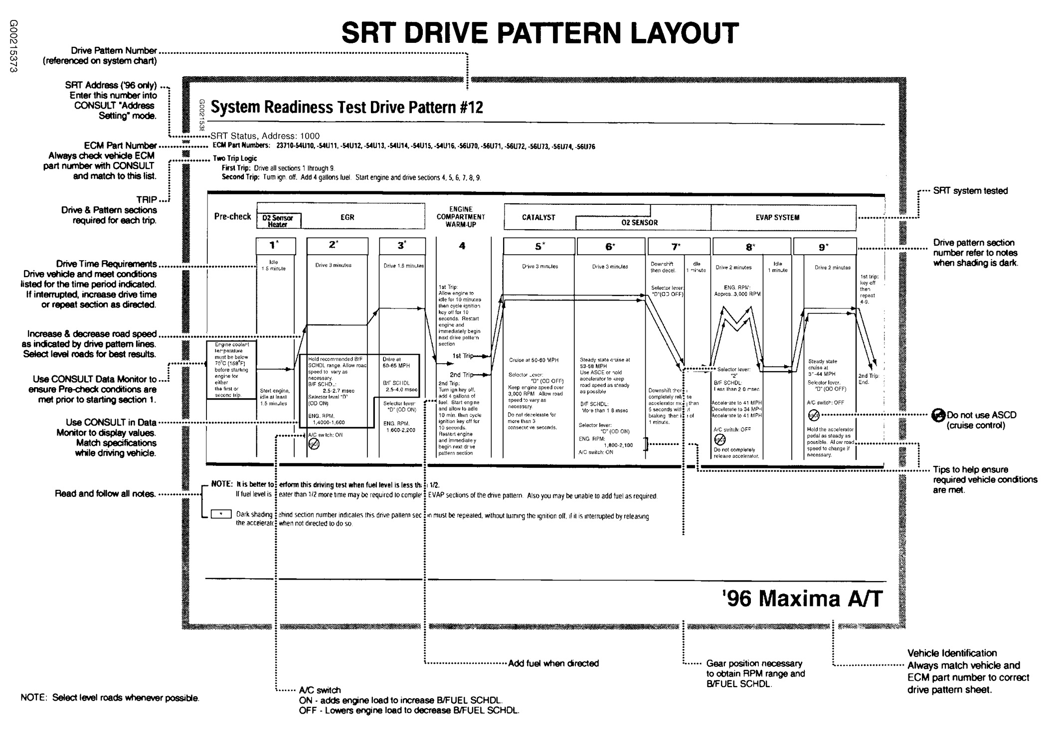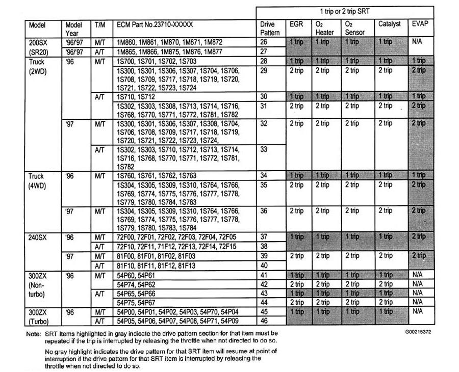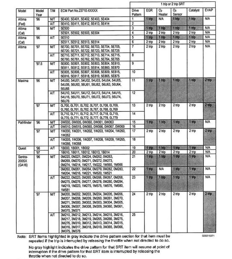 For more information on 1996 and 1997 SRT drive patterns, see Technical Service Bulletin No. ITB98-011C, dated March 22, 2002 for Infiniti, or Technical Service Bulletin No. NTB98-01C, dated January 3, 2003 for Nissan. See SYSTEM READINESS TEST (SRT) DRIVE PATTERNS .