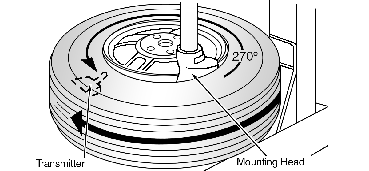 - Turn tire so that valve hole is at bottom, and gently bounce tire to ensure transmitter is near valve hole. Carefully lift tire onto turntable, and position valve hole (and transmitter) 270 degrees from mounting/dismounting head. See Fig 1.