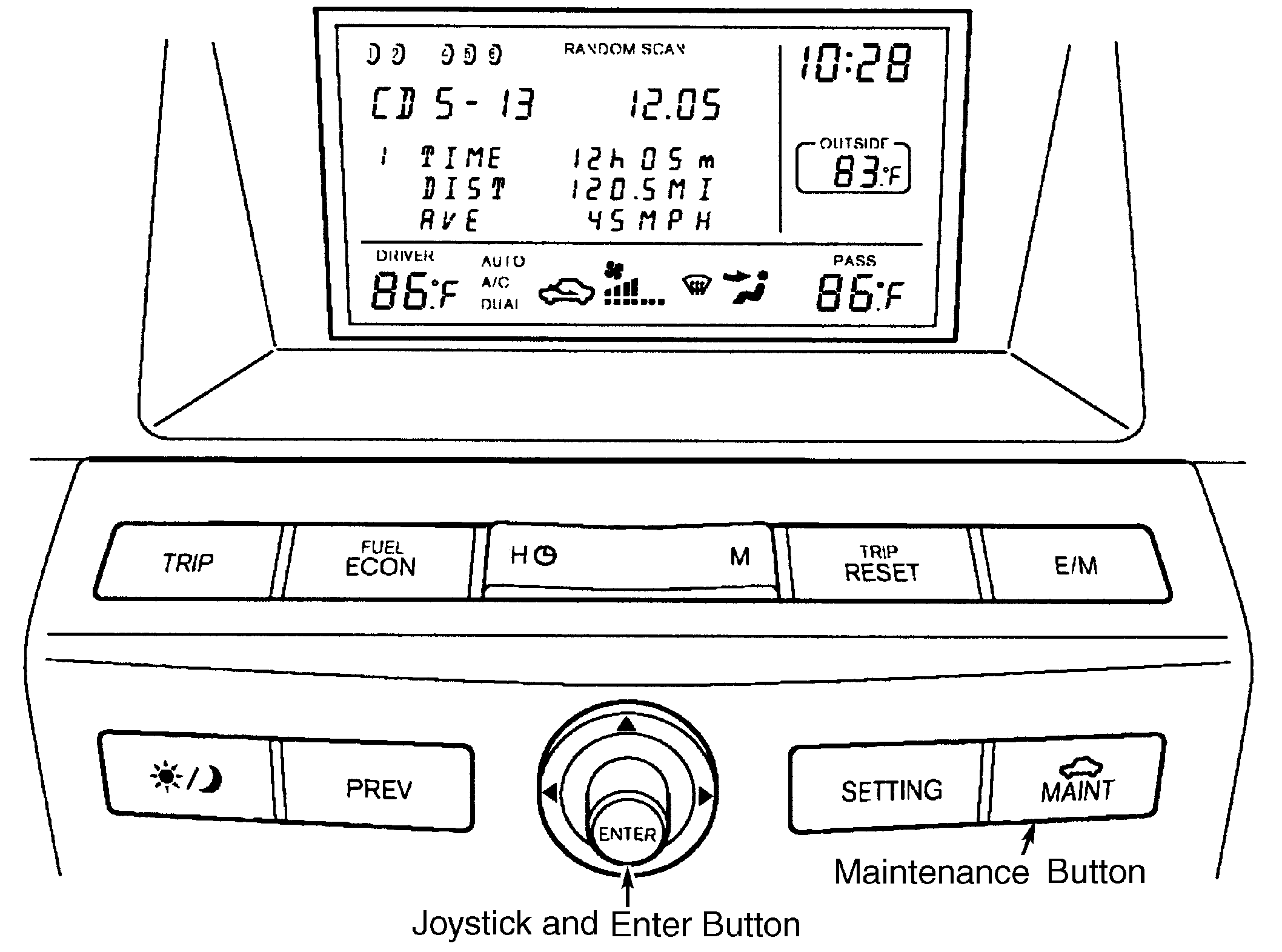 - Select the ENGINE OIL screen. To reset the maintenance reminder, push the MAINT or TRIP RESET button for at least 1.5 seconds. To adjust the distance until next reminder, push the CONTROLLER ARROWS (joystick) to left or right.NOTE: When the vehicle is driven the set distance, the MAINTENANCE NOTICE screen will be automatically displayed and the Maintenance menu ("ENGINE OIL", "TIRE ROTATION and "TIRE PRESSURE" (if so equipped) will blink.