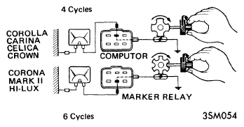 On Land Cruiser models, connections should be as shown for Corolla, Carina, etc. but reading should be six cycles.
