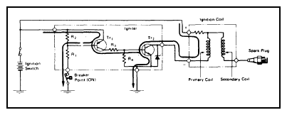 In the semi-transistorized ignition system, the distributor breaker points switch an igniter unit off and on. See Figure. Igniter unit, in turn, controls ignition coil primary current. This system provides higher secondary voltage in low speed range to improve starting and low speed performance, system also helps extend breaker point life.