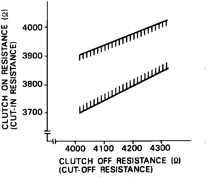3. Using an ohmmeter, measure resistance of variable resistor at magnetic clutch cut-off and cut-in. Correct cut-off resistance should be 4000 to 4300 ohms. Correct cut-in resistance is indicated in Fig. 14.