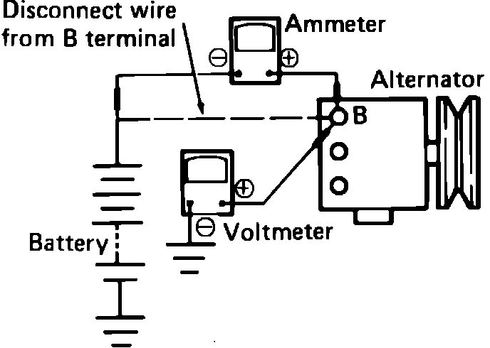 The following tests should be conducted with an alternator volt-amp tester, connected in accordance with manufacturer's instructions. If an alternator volt-amp tester is not available, connect a voltmeter and ammeter to the charging circuit as shown in Fig. 1.