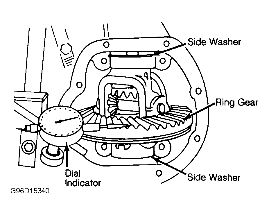 - Remove differential from transaxle. Install differential carrier on work stand with ring gear in horizontal position. Check ring gear backlash. See Fig 1 . If backlash in not within specification, adjust side baring preload or repair as necessary. Backlash should be .0039-.0059" (.10-.15 mm).