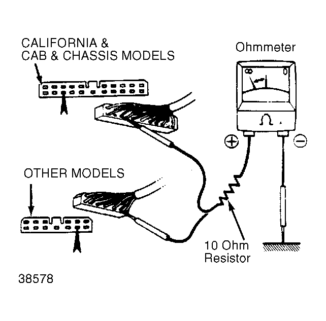 - Test "ON-OFF" cycles of speed sensor using an ohmmeter. See Fig 1. Insert a 10 ohm resistor in series with positive ohmmeter lead and insert lead in rear of connector. Connect negative terminal to ground.
