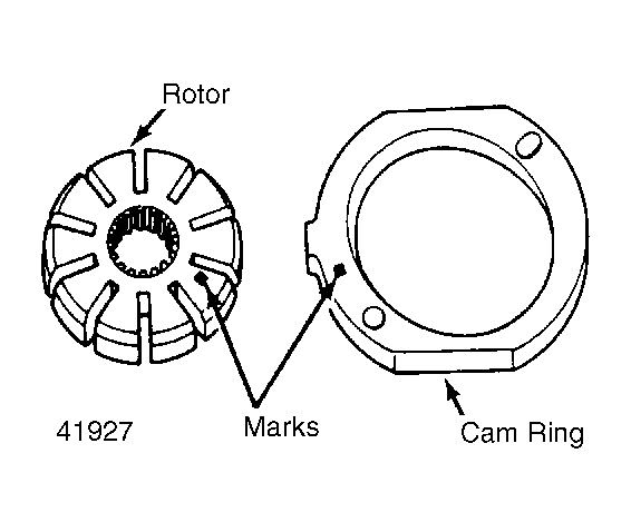 - Install vane plates with round end facing outward. Install new "O" ring on rear side plate. Align side plate holes with pins and install. Line up reference marks on front and rear housings.