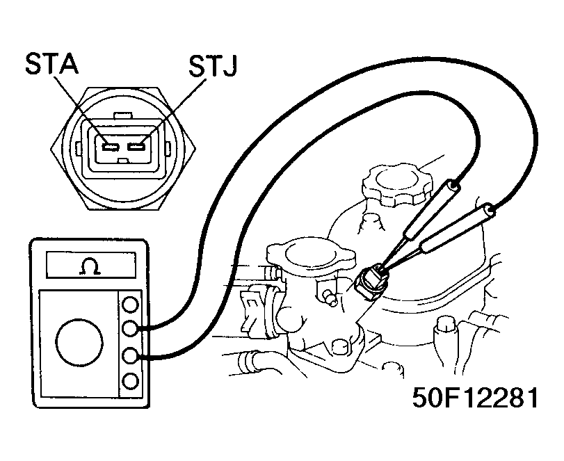 Disconnect switch connector. Note terminal identification. See Fig 1. Using ohmmeter, check resistance between terminals "STA" & "STJ" at appropriate temperature. See COLD START INJECTOR TIME SWITCH SPECIFICATIONS  table. Check resistance between terminal "STA" and ground. Replace switch if not within specification.