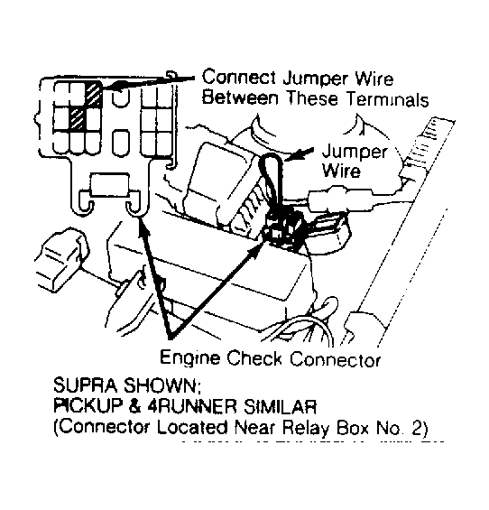 2. Turn ignition switch to "ON" position, but DO NOT  start engine. Using a jumper wire, short terminals T - E1 of engine check connector. See Fig 1.