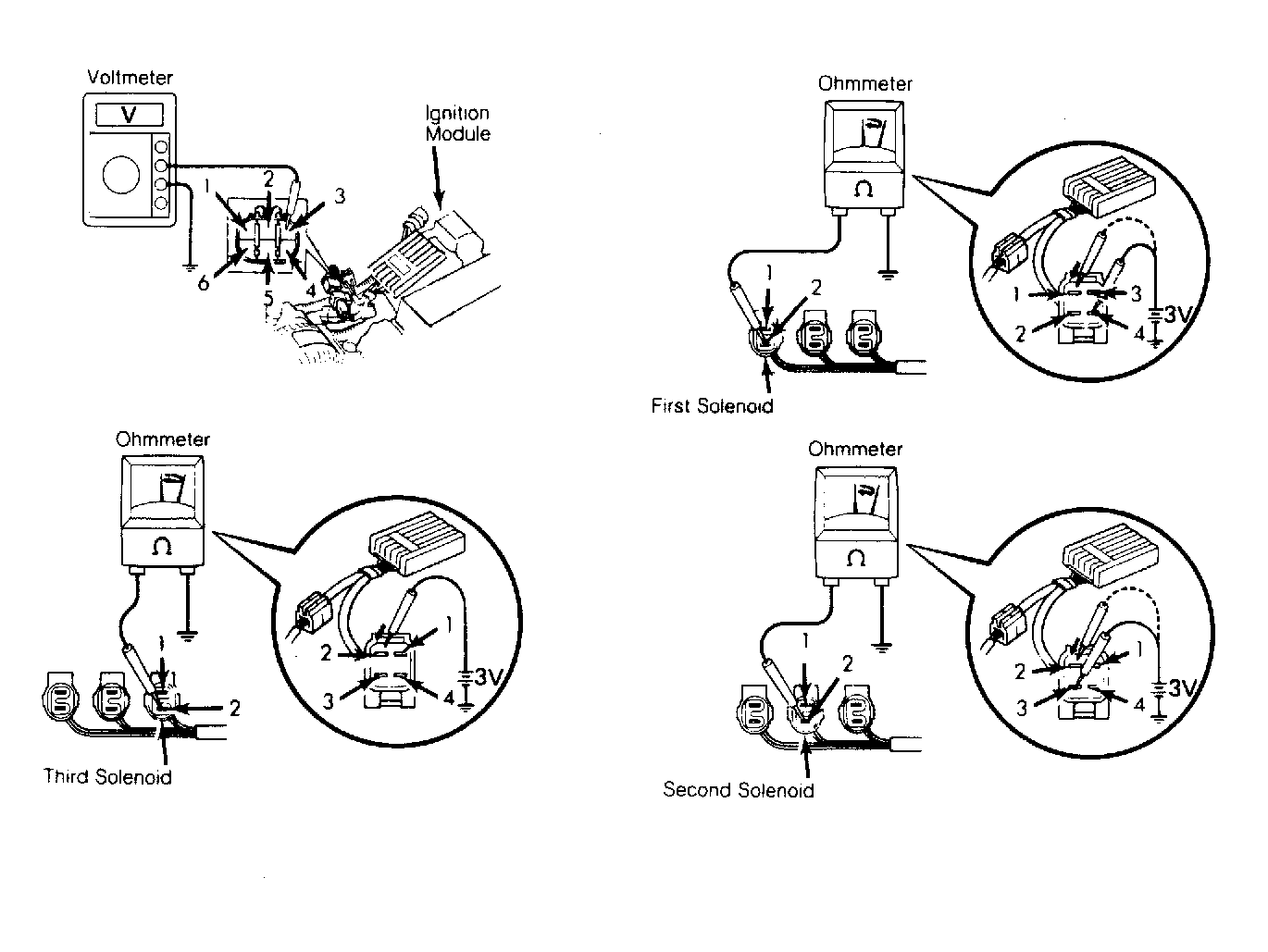 - Connect an ohmmeter between terminal No. 2 of second ignition coil and ground. Apply 3 volts to terminal No. 3 of 4-pin connector. See Fig 1. With 3 volts applied, check that ohmmeter indicates momentary continuity.
