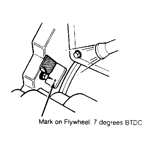 1. Warm up engine. Disconnect vacuum hose from the distributor sub-diaphragm and plug hose end. Check ignition timing at idle. Ignition timing should be 7 degrees BTDC. See Fig 1. Reconnect hose to sub-diaphragm. Verify that timing mark on flywheel advances to 6 degrees.