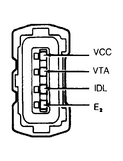 - Connect a tachometer to engine (to monitor needle fluctuations). Start engine and warm to operating temperature. Disconnect throttle position sensor connector from throttle position sensor. Short terminals IDL and E1 (or E2) on wire side of connector. See Fig 1.