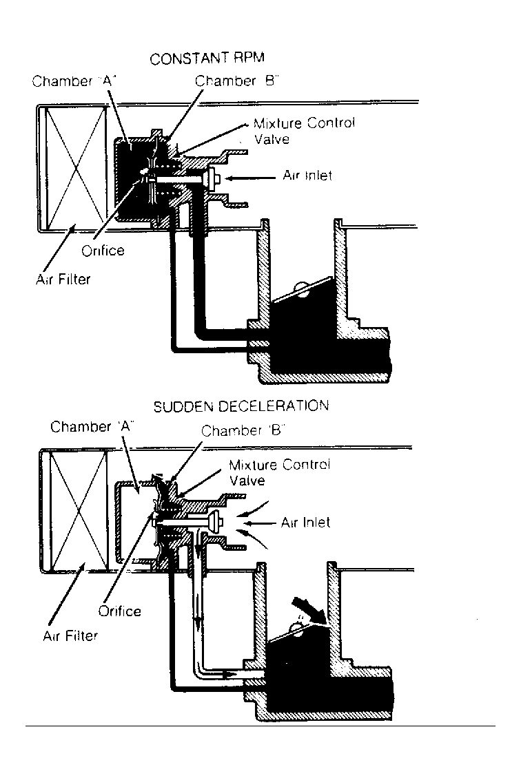 Remove air cleaner cover and air filter. Start engine. Disconnect vacuum hose from MC valve. Ensure no vacuum is present at air inlet of MC valve. See Fig 1. Reconnect vacuum hose. Vacuum should momentarily be present at air inlet. It is normal for engine at this time to idle rough or die. Replace MC valve as necessary.