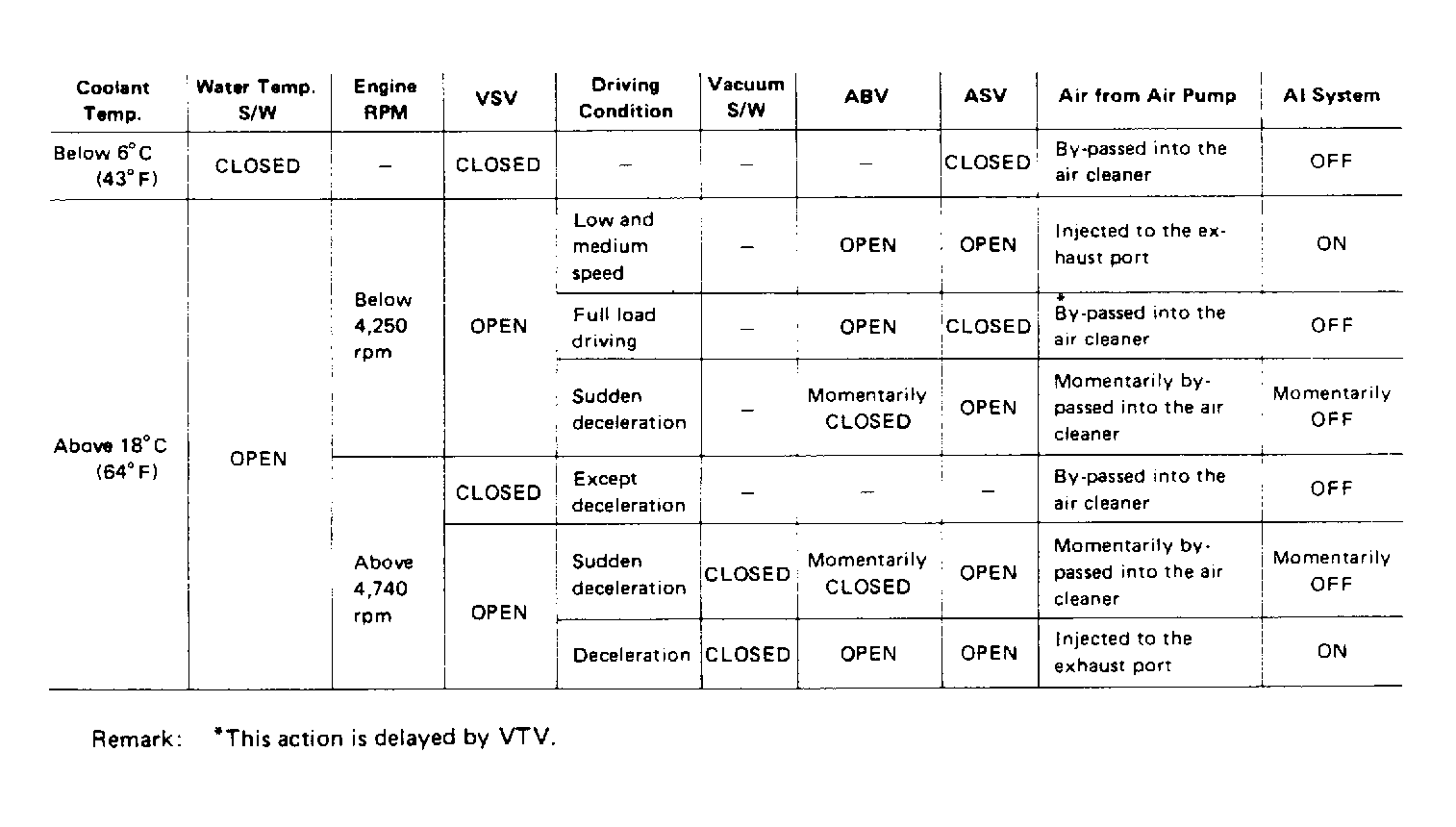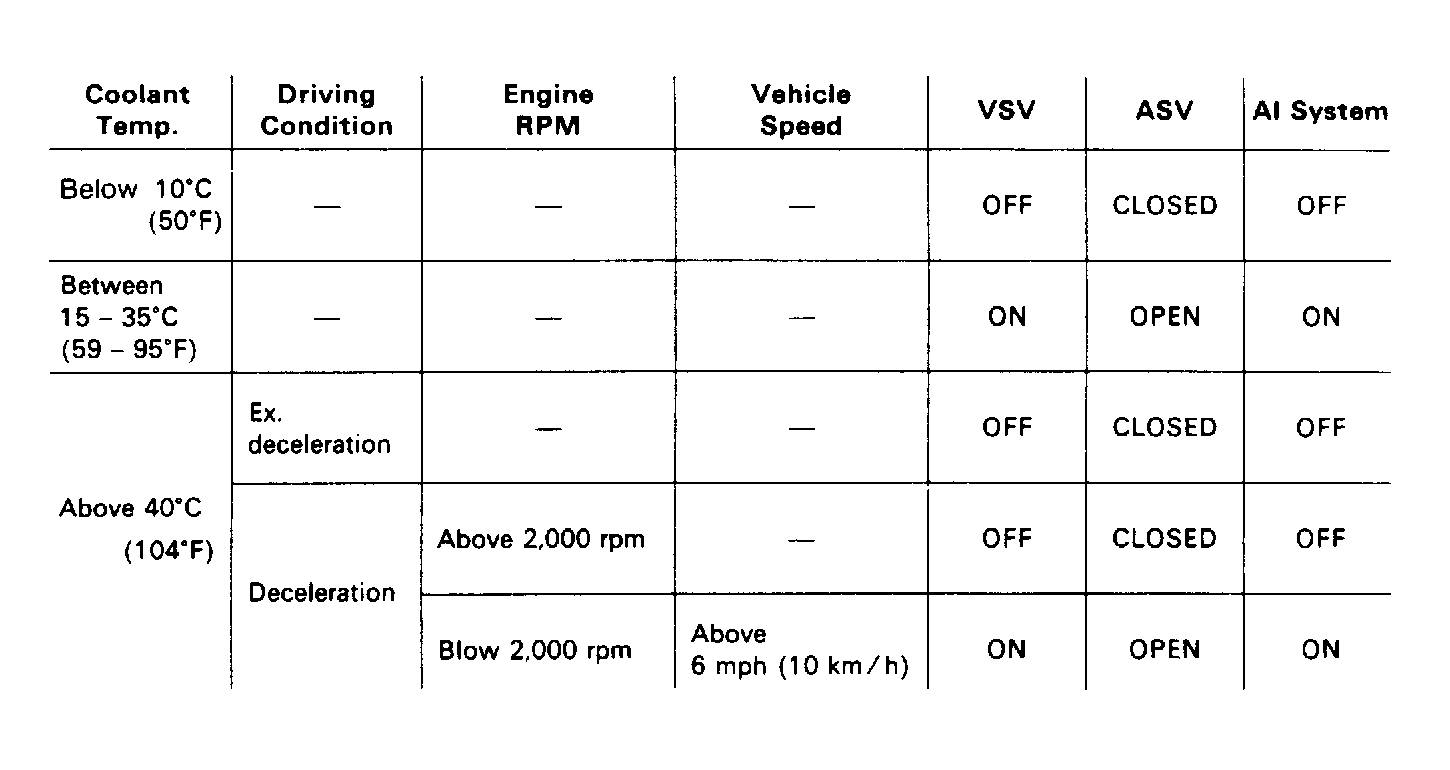 Air Injection (AI) system is to aid in the reburning of the unburnt HC and CO content in the exhaust. Fresh air is drawn from air cleaner and compressed via air pump. This compressed air is directed into the exhaust port or atmosphere as determined by ECU. ECU receives various valve signals, depending on engine operating conditions, to determine compressed air flow. See Fig 1 or Fig 2 .