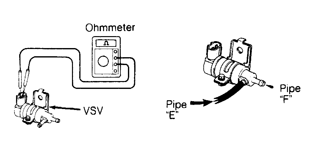 - Check that air does not flow from pipe "E" to pipe "F". If air flows through from pipe "E" to pipe "F", replace VSV.