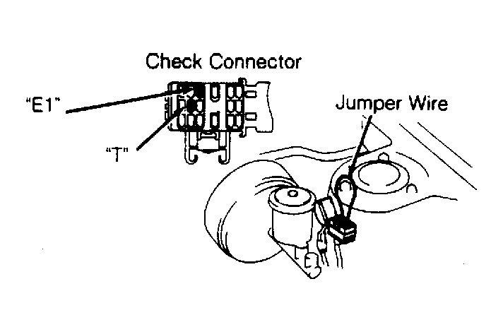 1. Warm engine to normal operating temperature. Ensure idle speed is correct. Apply parking brake and place transaxle in Neutral. Install jumper wire between terminals "T" and "E1" of check connector located near left shock tower. See Fig 1.