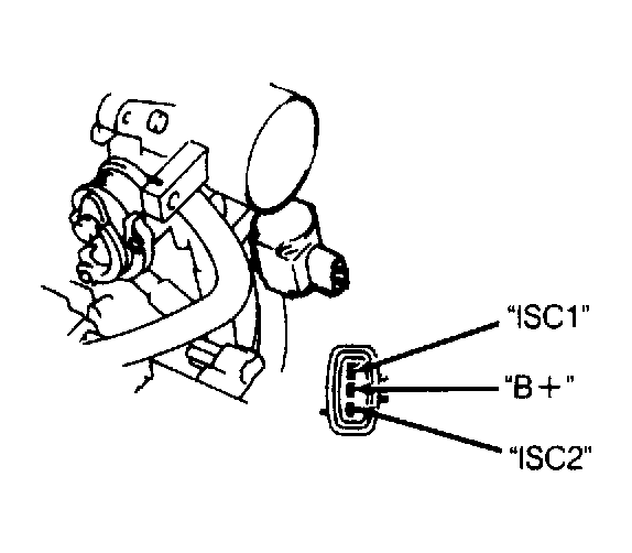 3. If engine RPM was not within specification, disconnect ISC valve connector. Using ohmmeter, measure resistance between terminals "B +" and "ISC1" AND "ISC2". See Fig 2. Replace valve if resistance is not within 16-17 ohms.