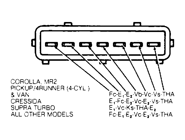 Disconnect airflow meter connector. Using an ohmmeter, measure resistance across meter terminals. On Supra Turbo models, an analog ohmmeter must be used. Supra Turbo models have a 5-terminal airflow meter connector. See Fig 1. For airflow meter specifications, see AIRFLOW METER RESISTANCE  table.