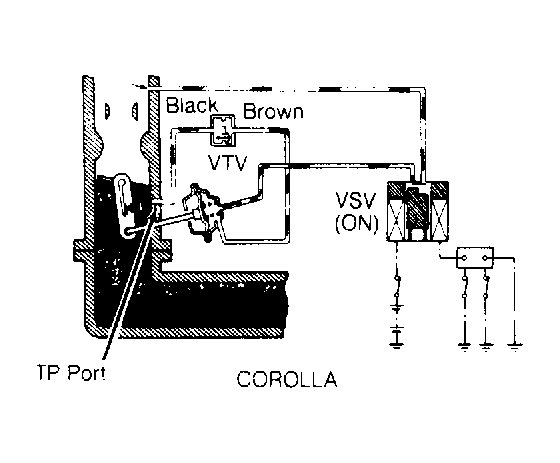 1. Warm engine to normal operating temperature. Check idle speed and adjust if necessary. On Corolla FX models, disconnect hose from TVSV "M" port and plug "M" port. See Figure. This disconnects choke opener and EGR system.