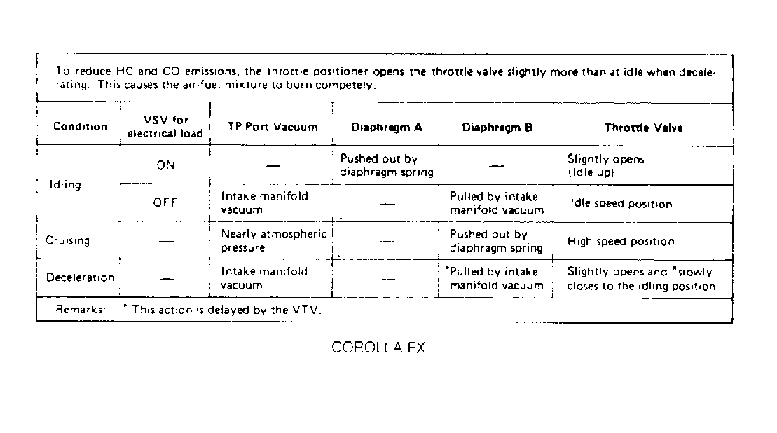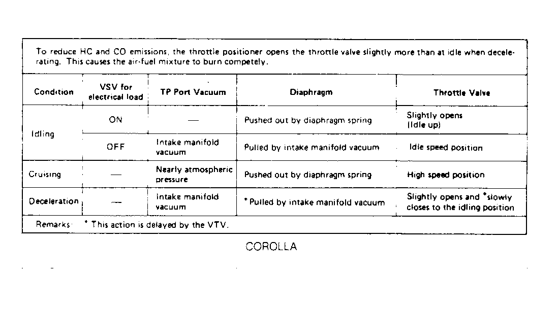 The Throttle Positioner (TP) system controls exhaust emissions during deceleration by holding throttle plate at an above-idle position during deceleration. This aids in complete burning of the air/fuel mixture.