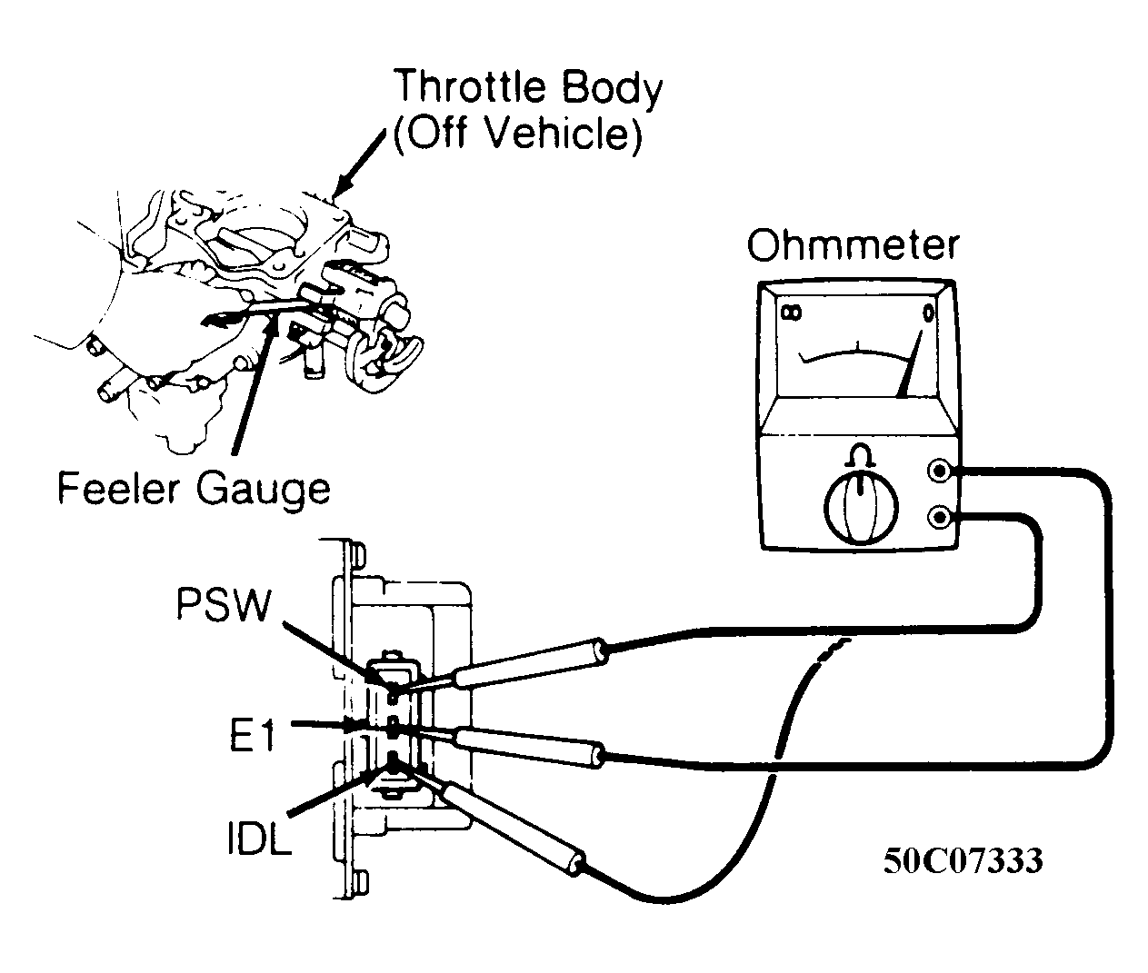 Turn ignition off and disconnect electrical connector at TPS. Note terminal identification. See Fig 1. Insert specified thickness feeler gauge between throttle stop screw and throttle ever. See TPS RESISTANCE SPECIFICATIONS  table. Using an ohmmeter, check for resistance or continuity. Replace or adjust TPS if not within specification. See TPS RESISTANCE SPECIFICATIONS  table.