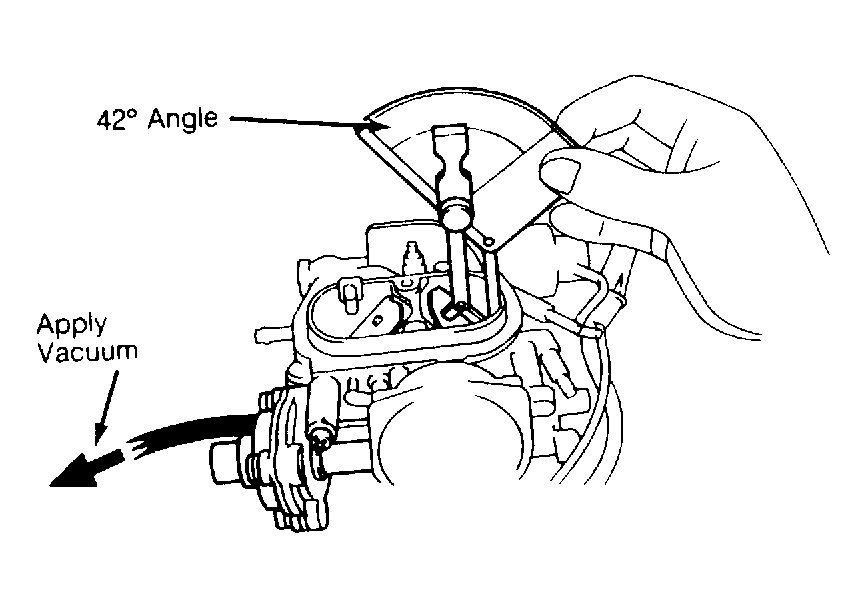 Fully open primary throttle valve. Insert angle gauge and measure choke valve angle. Choke valve angle should measure 45 degrees. Adjust by bending primary throttle arm. See Fig 1.