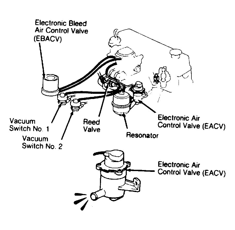 6. Reduce engine to idle. Check idle operation. With engine speed less than 1000 RPM, check that a bubbling noise can be heard from EACV. Reconnect AS hose to EACV after testing air suction system.
