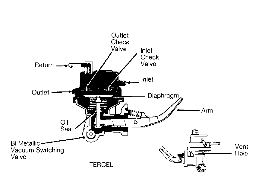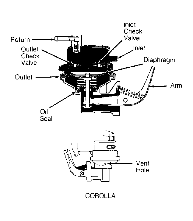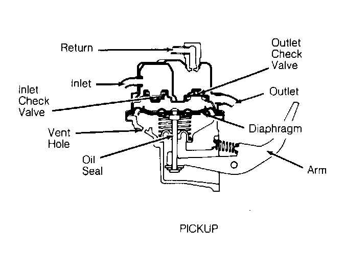 4. Check pump diaphragm. Block off inlet and outlet fittings. Check that pump arm locks. Check oil seal. Block off vent hole and check that fuel pump arm locks. If fuel pump does not operate as described, replace pump.