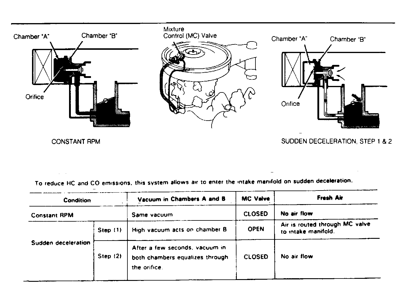 1. Remove air cleaner. Start engine. Disconnect vacuum hose from MC valve. Check that vacuum is felt from MC valve air inlet. See Fig 1.