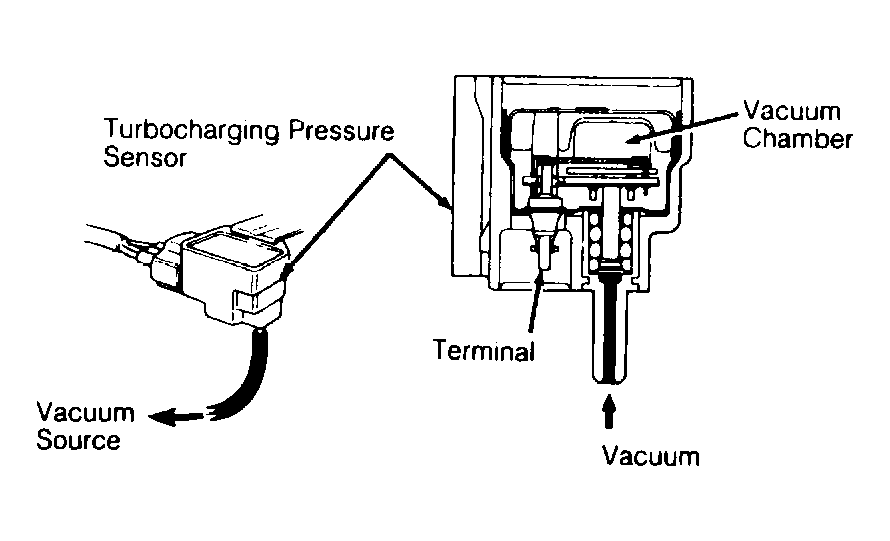 - Attach a vacuum pump to turbocharging pressure sensor vacuum hose and apply vacuum in specified stages. See Fig 2. Measure and record voltage readings for each stage of applied vacuum. See the VACUUM/VOLTAGE SPECIFICATIONS table. Replace sensor if readings are not within specifications.