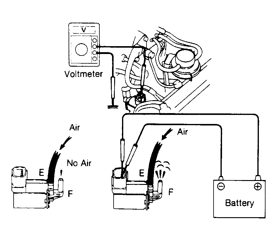 - Air control valve should be activated during cranking and for 10 seconds after engine starts. Check for battery voltage at air control valve during cranking and after engine starts. If voltage not present, check wiring from EFI main relay, and wiring to "V-ISC" terminal at ECU.
