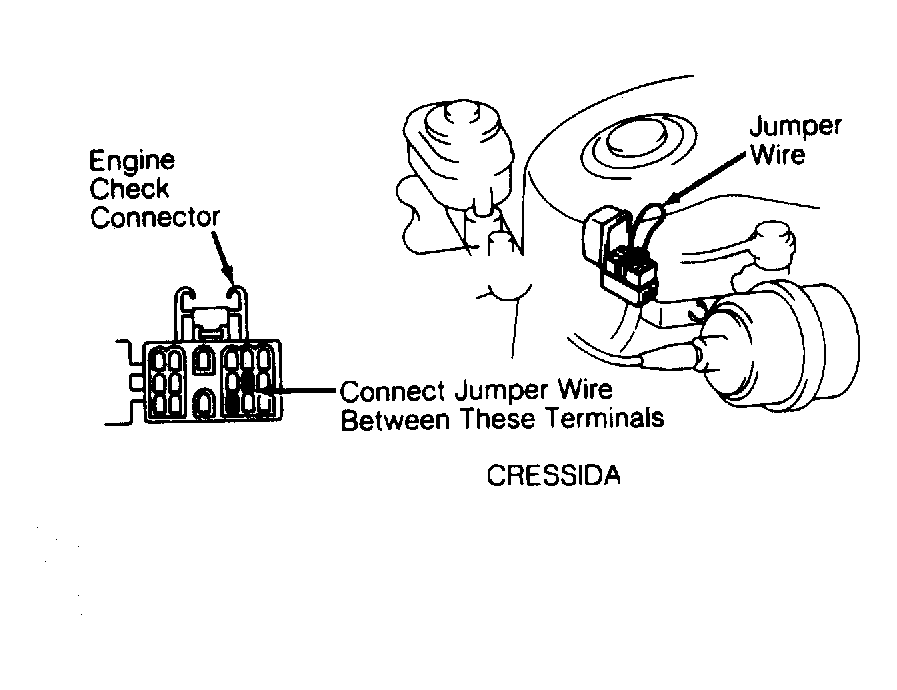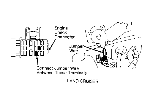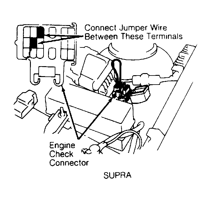 - Install jumper wire between proper terminals of engine check connector. See Fig 4, Fig 5 and Fig 6. Ensure that the idle speed is within specification. See IDLE SPEED SPECIFICATIONS table. Ensure base timing is within specification. See 6-CYLINDER IGNITION TIMING (Degrees BTDC @ RPM) table. Adjust timing by turning distributor.