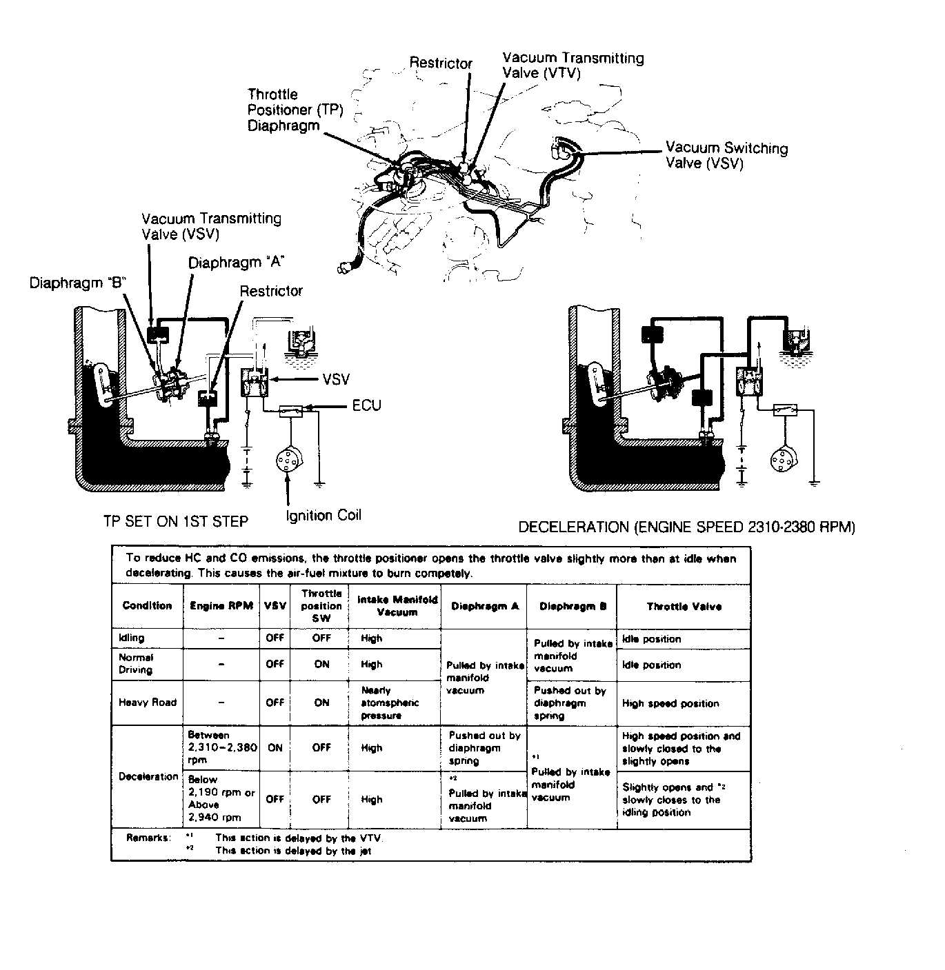 - If TP does not function as described, test individual components. Test Vacuum Switching Valve (VSV), Vacuum Transmitting Valve (VTV), TP diaphram and restrictor.