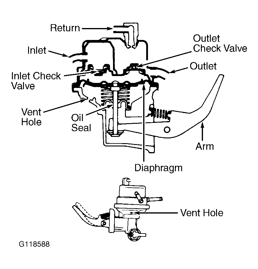 4. Check pump diaphragm. Block off inlet and outlet fittings. Ensure pump arm locks. Check oil seal. Block vent hole and ensure fuel pump arm locks. If fuel pump does not operate as described, replace pump.