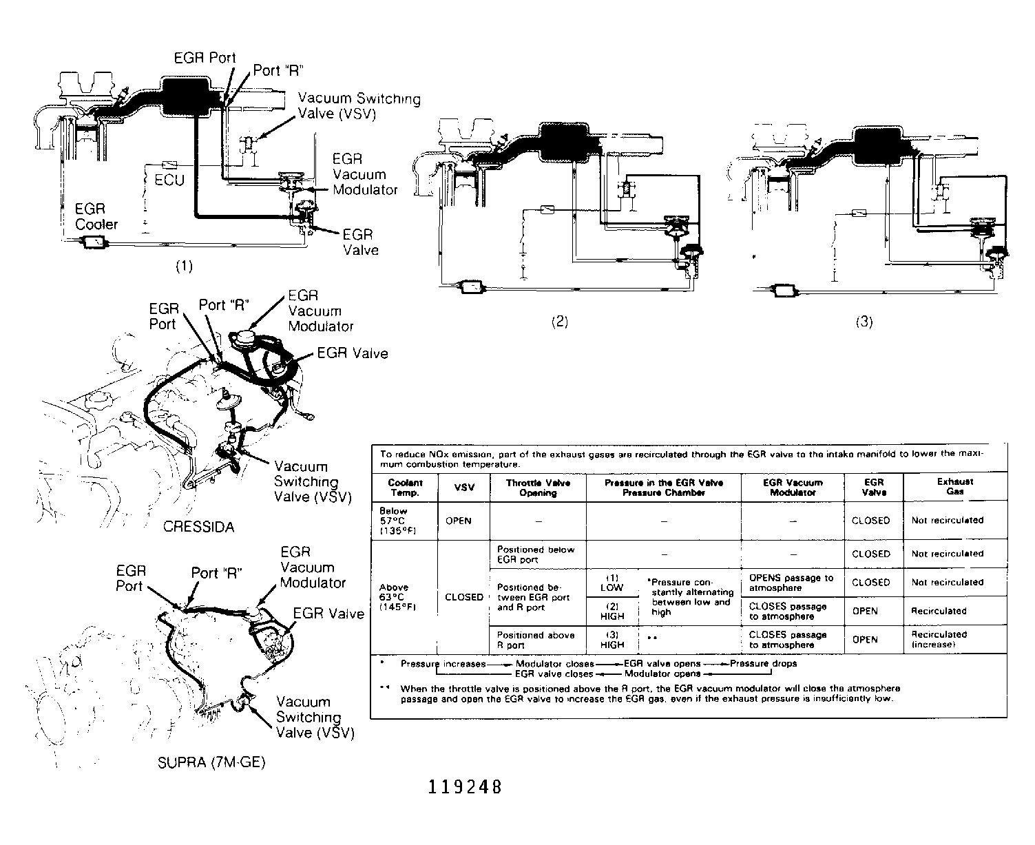 - Different vacuum switching valves are used depending on model. See Figure and Figure. The Vacuum Switching Valve (VSV) and EGR modulator can be checked with engine coolant temperature less than minimum temperature and specified engine RPM in accordance with application. See EGR SPECIFICATIONS table.