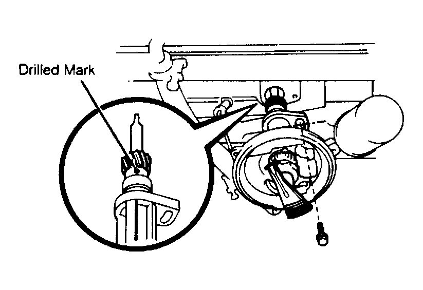 2. Install new "O" ring into distributor housing. Coat "O" ring with oil. Install distributor with mounting flange aligned with bolt hole on cylinder head and drilled mark on drive gear facing upward. See Fig 2.