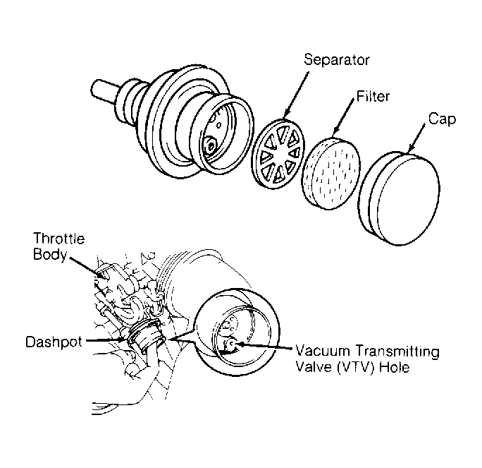 1. Engine must be at normal operating temperature. Check idle speed and adjust if necessary. Remove cap, filter and separator from dashpot. See Fig 1.