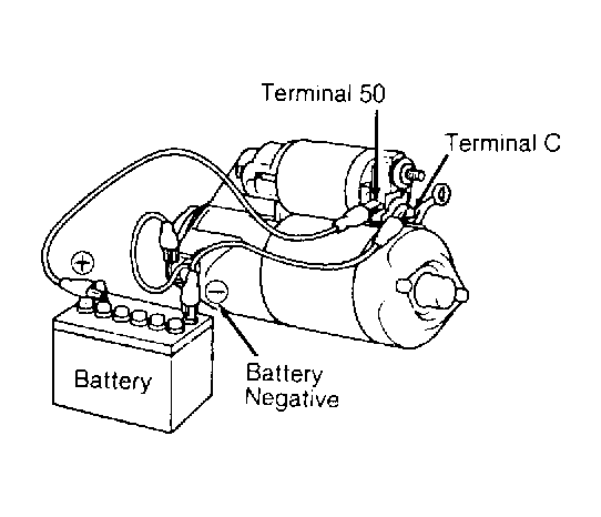 Connect negative leads to starter housing and terminal "C". Connect battery positive lead to terminal 50. See Fig 1. If starter pinion gear does not move out, replace solenoid.