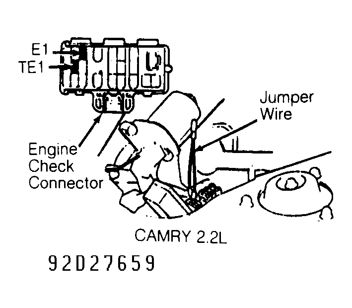 - Apply parking brake and place transmission/transaxle in Neutral. Install jumper wire between terminals TE1 and E1 of engine check connector. See Fig 1.