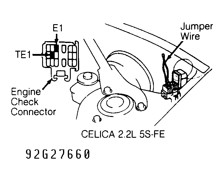 - Apply parking brake and place transmission/transaxle in Neutral. Install jumper wire between terminals TE1 and E1 of engine check connector. See Fig 1.