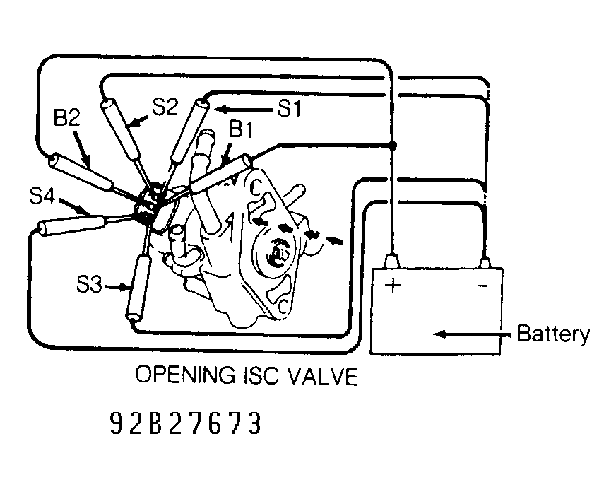 Terminals Ohms B1 To S1 Or S3 10-30 B2 To S2 Or S4 10-30 NOTE: Before removing ISC valve, drain coolant from cooling system. Remove both coolant by-pass hoses. - To check ISC valve operation, remove ISC valve. Apply battery voltage to terminals B1 and B2. See Fig 2 and Fig 3 . Repeatedly ground terminals in sequence and ensure ISC valve closes and opens. See ISC VALVE GROUNDING SEQUENCE table. Replace ISC valve if defective.