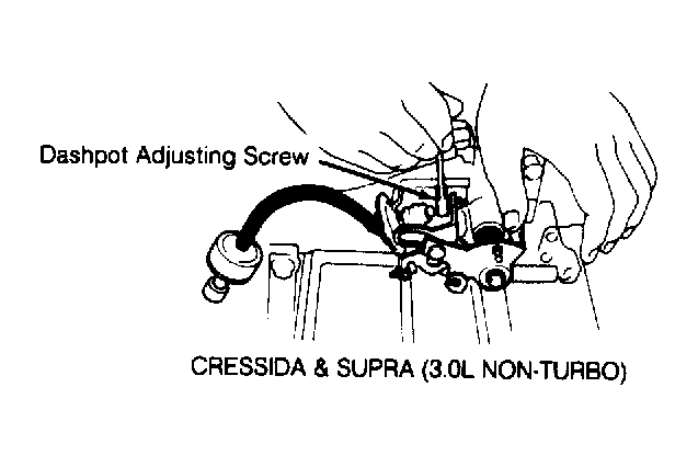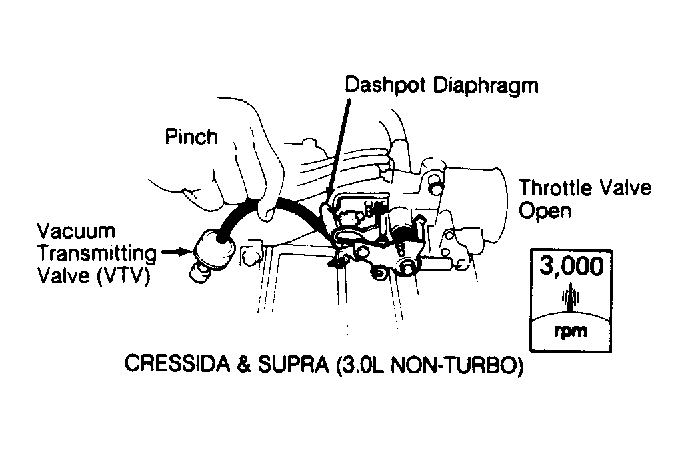 - Raise engine speed to 3000. Pinch vacuum hose between dashpot and Vacuum Transmitting Valve (VTV). See Fig 1. Release throttle valve. Ensure dashpot is set and engine RPM is 2000. See Fig 2.